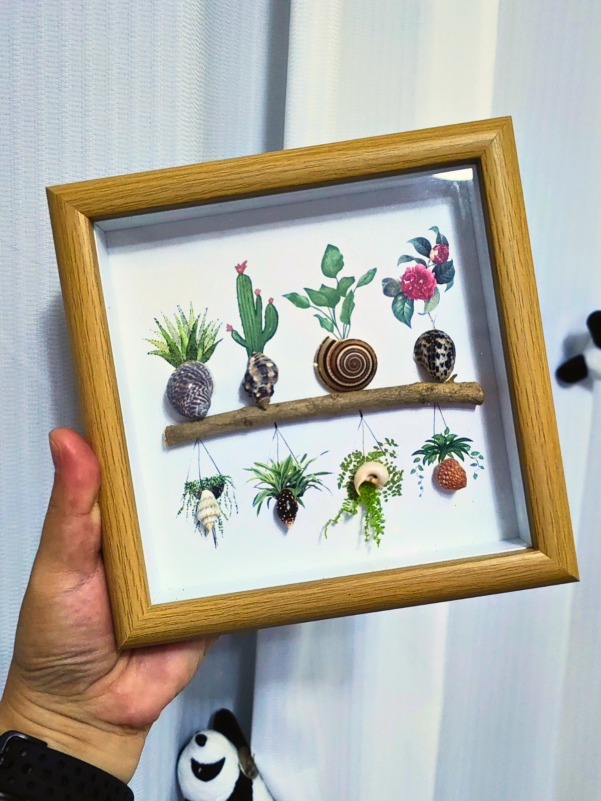 • Natural Materials: Features authentic seashells arranged on a printed coastal backdrop