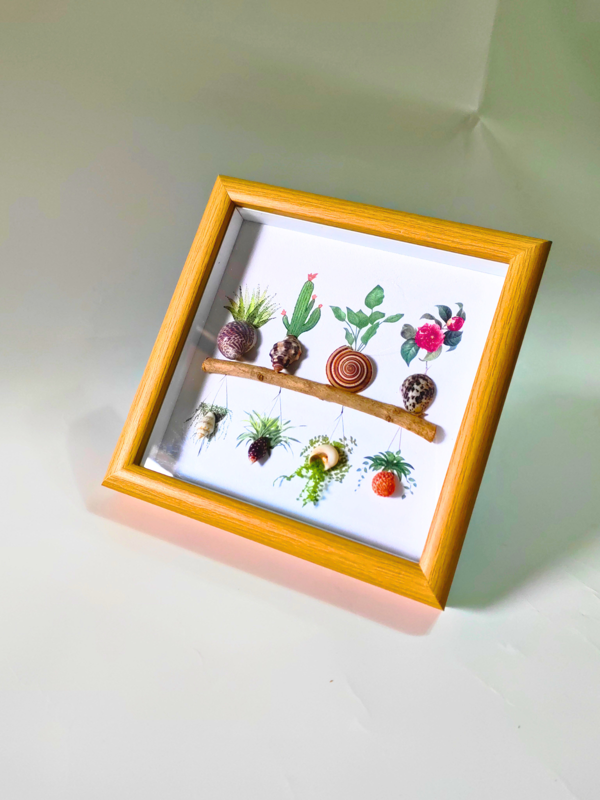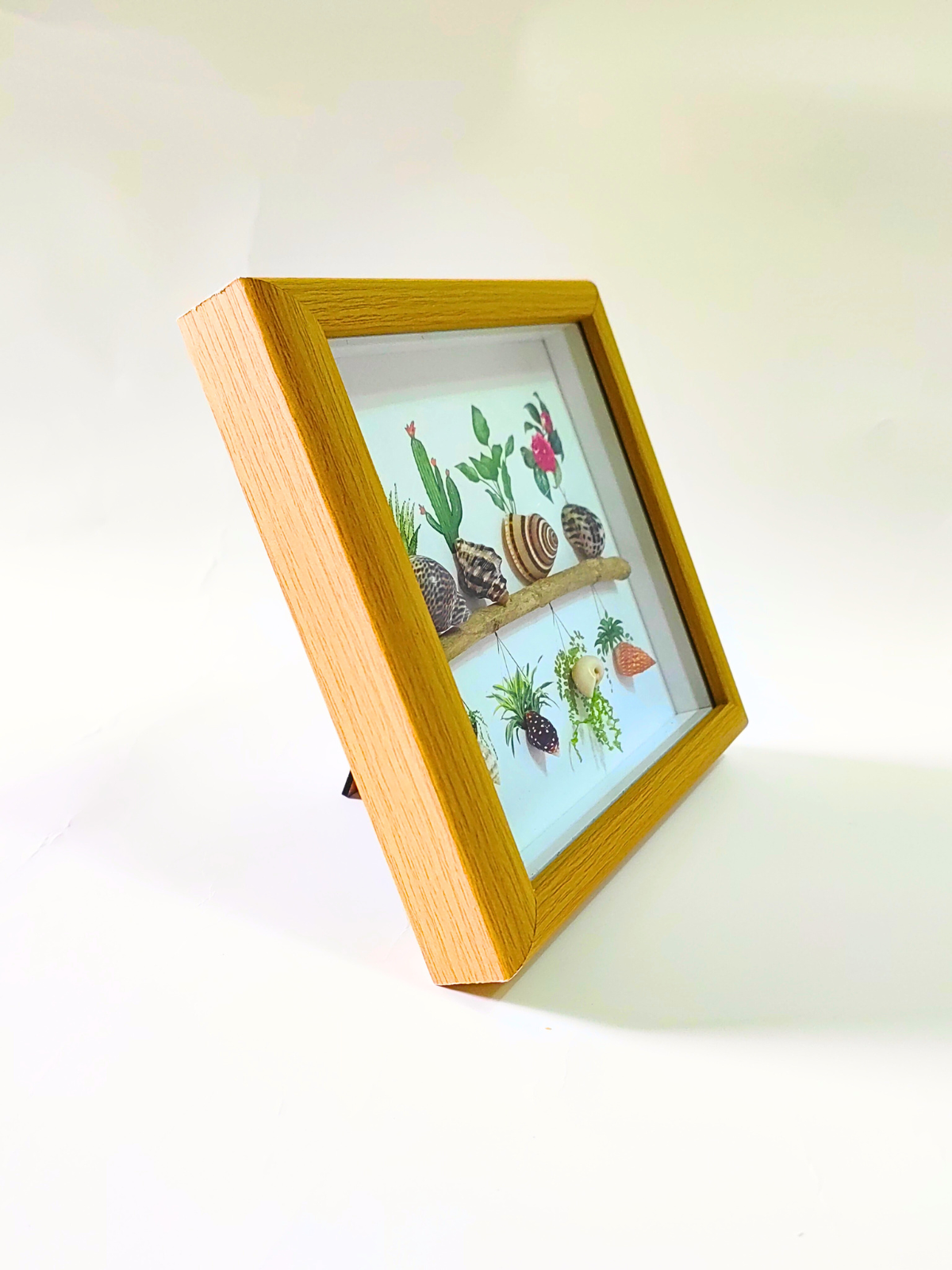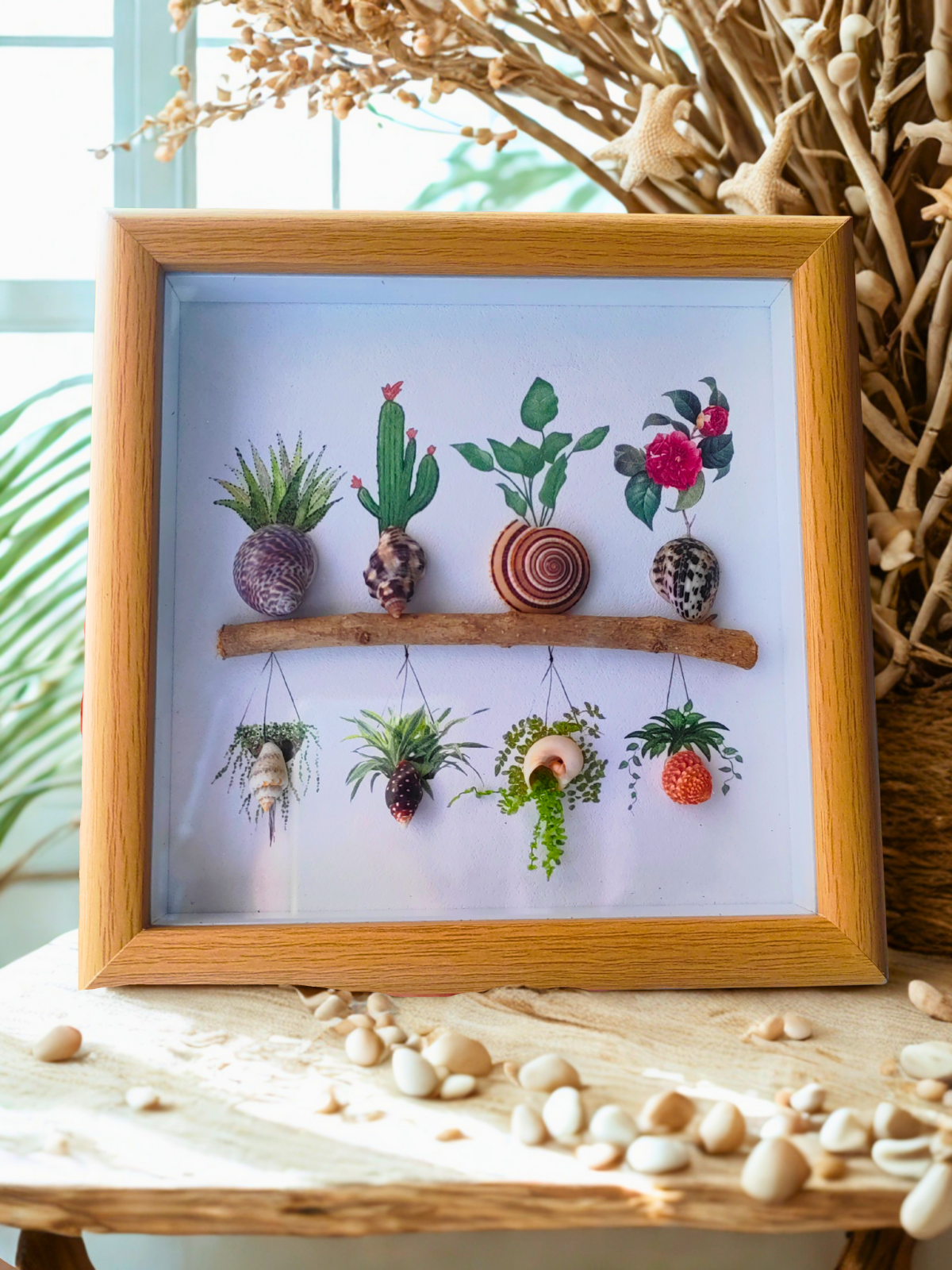 The combination of three-dimensional shells with two-dimensional illustration creates depth and visual interest. The square format offers a modern presentation option for coastal decor themes.