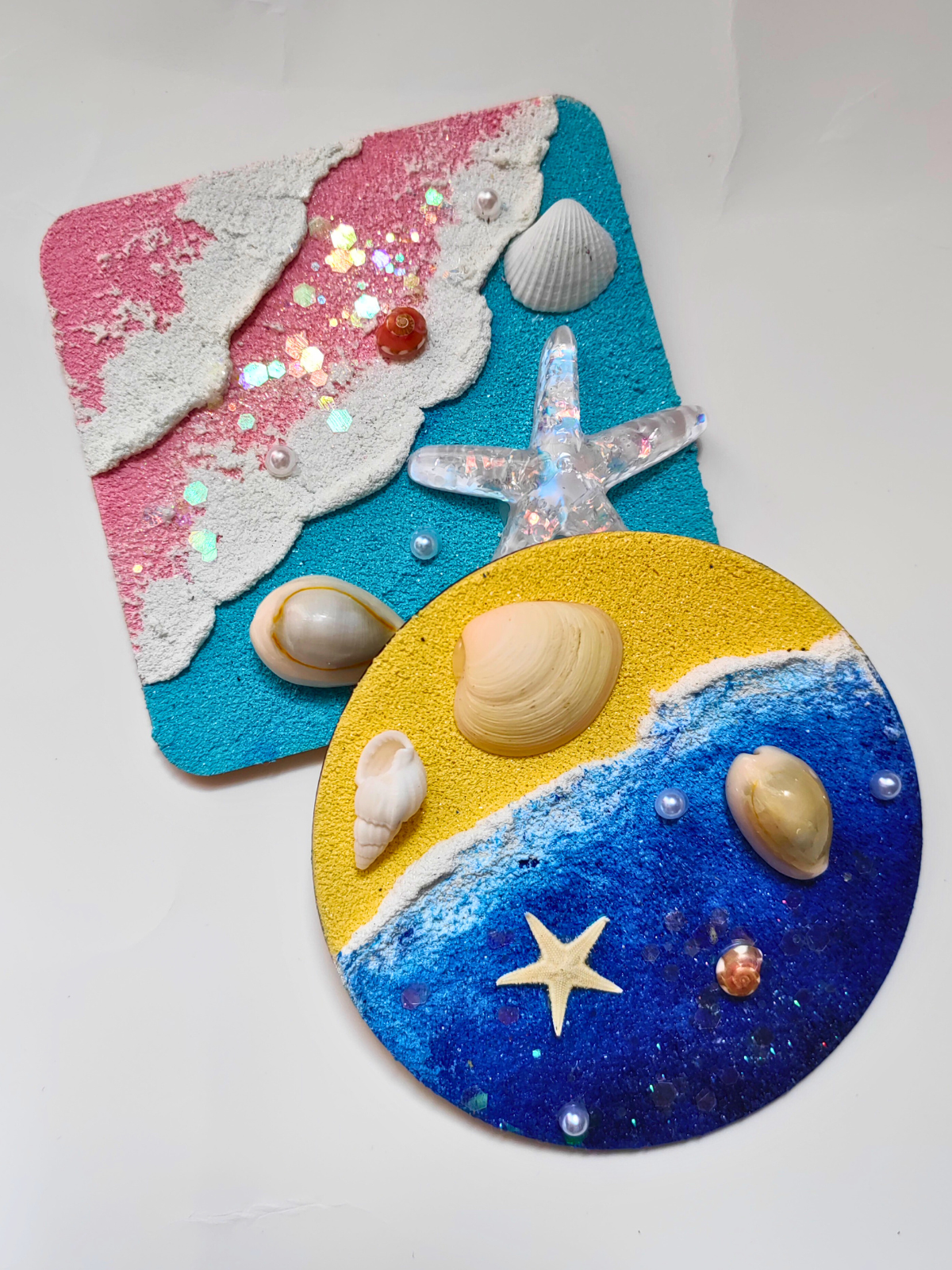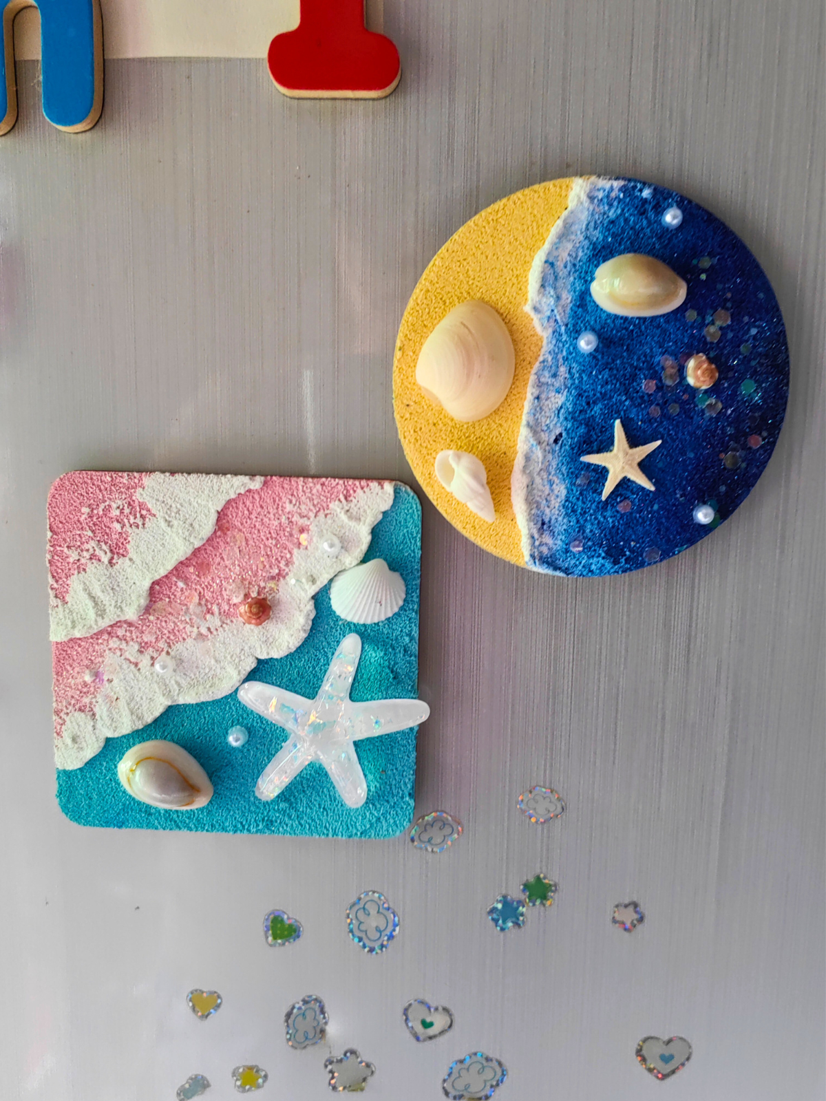 Bring the serene beauty of the ocean to your fridge or magnetic surface with our Ocean Magnets collection. This set features one round and one square design, each crafted on lightweight wooden bases. The bases are painted in soothing ocean hues—primarily blues with accents of pink and white waves—and decorated with tiny seashells and beads, creating a miniature coastal scene perfect for adding character to any space.